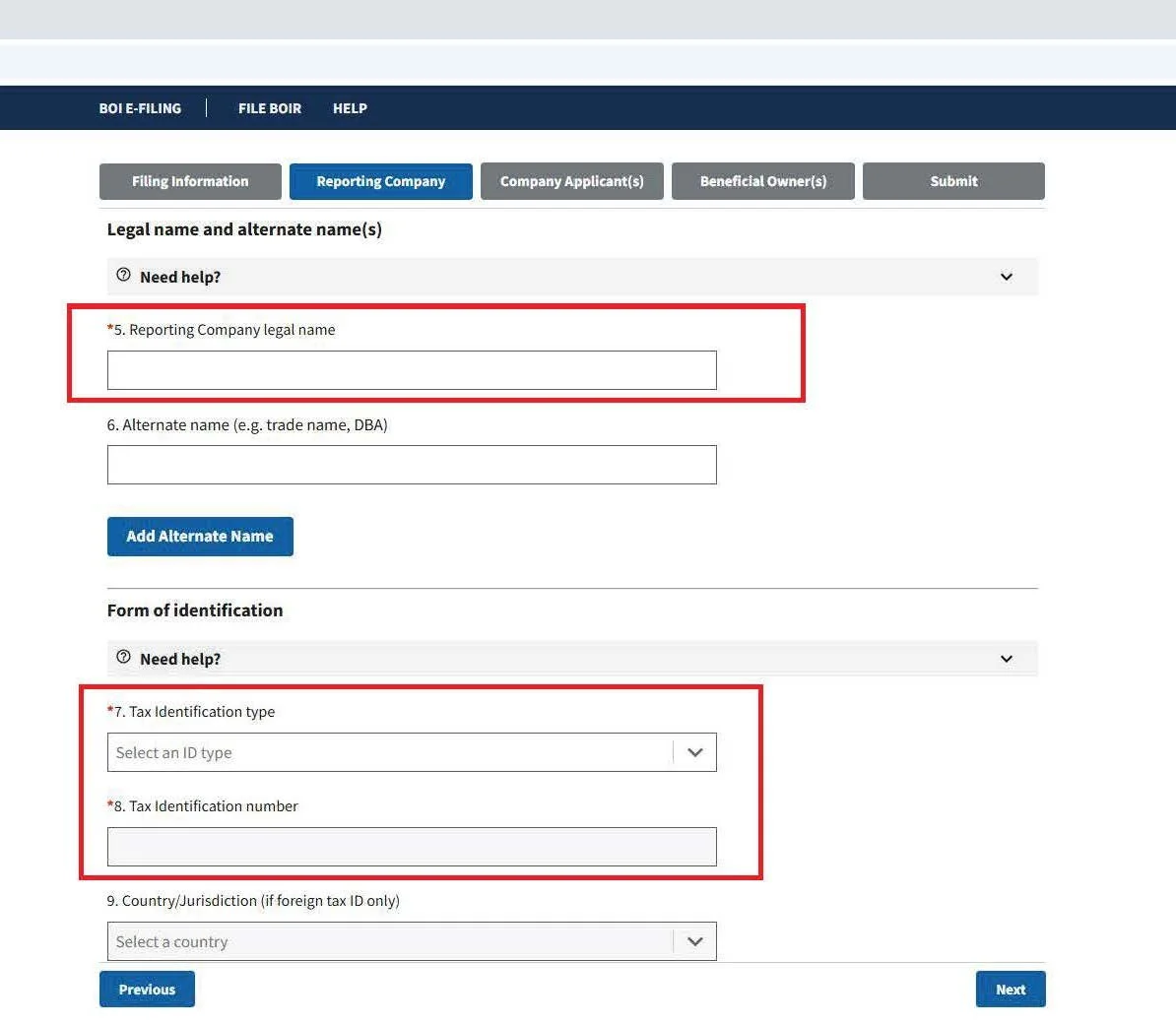Corrected Prior Report, Update Prior Report, or Newly Exempt Entity is selected – must complete the Legal Name, Tax Identification Type, and Tax Identification Number fields with the reporting company information from the company’s most recently filed prior BOIR.